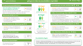 Die wichtigsten Regelungen ab 19. März bis einschließlich 2. April 2022 -z.B.: Keine Kontaktbeschränkungen bei Zusammenkünften und Feiern Bei mehr als 50 Personen gilt 3G-Regel (drinnen/draußen) , 3G-Regel in der Innengastronomie und FFP2-Maskenpflicht drinnen bis zum Sitzplatz usw. finden Sie hier auf dieser...