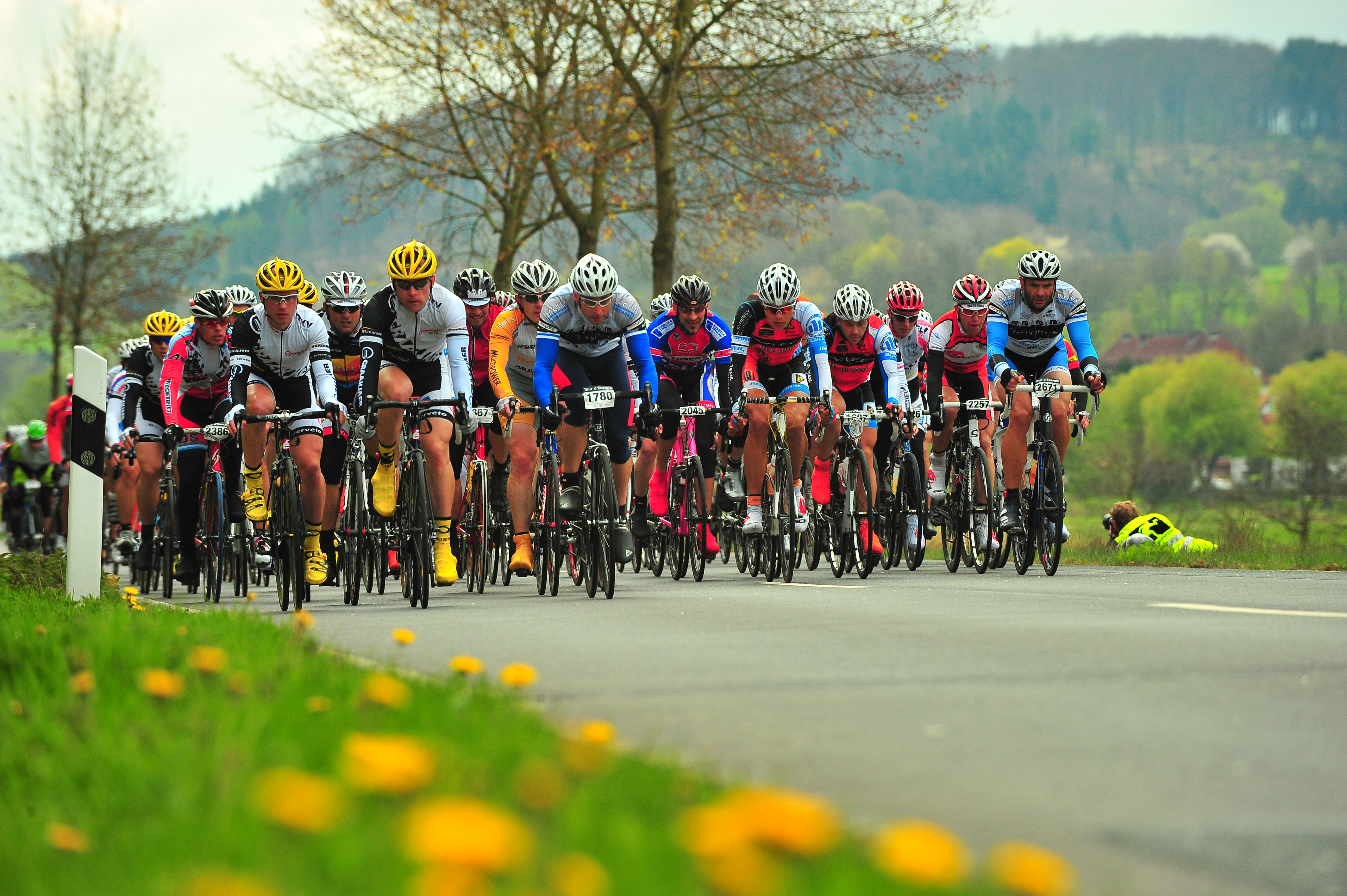 Bei kühlen Temperaturen um 11°C und wolkenverhangenem Himmel erfolgte um 10:30 der Start für das 46 Kilometer Rennen, nur knapp 10 Minuten später wurden die 100 Kilometerfahrer auf die Reise geschickt. Während auf der kurzen Strecke „nur“ der Hohe Hagen auf dem Programm stand ein Berg mit 10% Steigung, mussten auf der langen Strecke 4 Berge erklommen werden darunter die rund 7 Kilometer lange Auffahrt zum Bramwald. Die Finale Steigung war auch hier der Hohe Hagen, an dem es hieß noch einmal alle Kräfte zu mobilisieren. Aufgrund der vielen Zuschauer schon am Fuße des Berges konnte noch so manche Notreserve gezündet werden. Oben angekommen folgte nur noch die gefährliche aber perfekt abgesicherte Abfahrt und ein 20 Kilometer langes Flachstück, das dank Rückenwind in hohem Tempo genommen werden konnte.