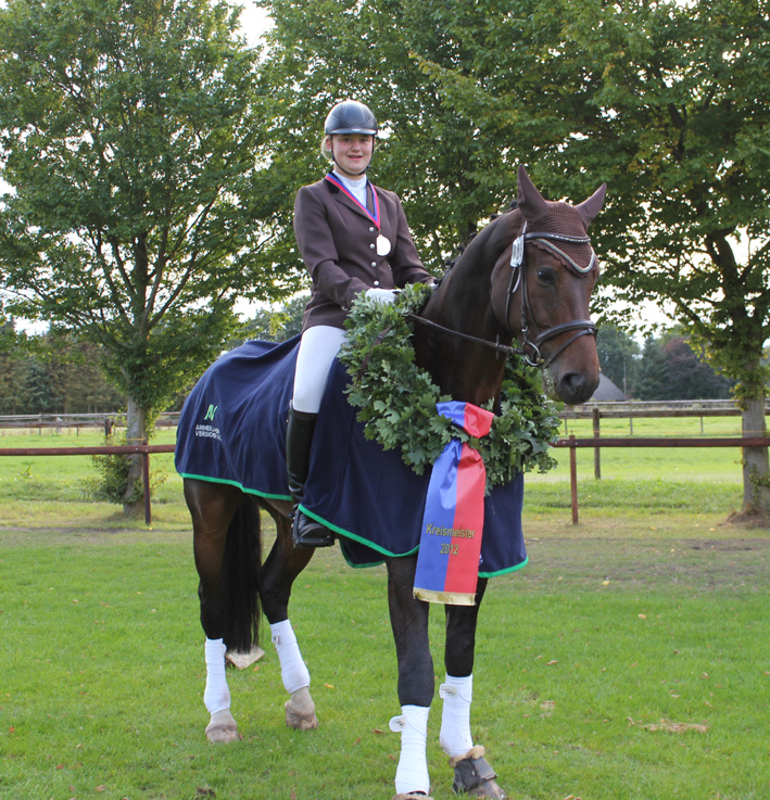 Im Vorfeld gab es auf verschiedenen Turnieren Qualifikationsprüfungen, auf denen sich die Teilnehmer das „Ticket“ für die Kreismeisterschaft erreiten konnten. Am vorletzten September-Wochenende mussten diese Reiter dann ihr Können ein weiteres Mal in verschiedenen Prüfungen unter Beweis stellen. Erst am Sonntag Abend standen dann alle Ergebnisse fest, so dass für die unterschiedlichsten Sparten und Leistungsklassen die Reiter und Pferde geehrt werden konnten. Die Ehrung geschieht im Kreis Ammerland übrigens noch auf traditionelle Weise: alle Sieger(-pferde) erhalten einen Kranz aus Eichenlaub.