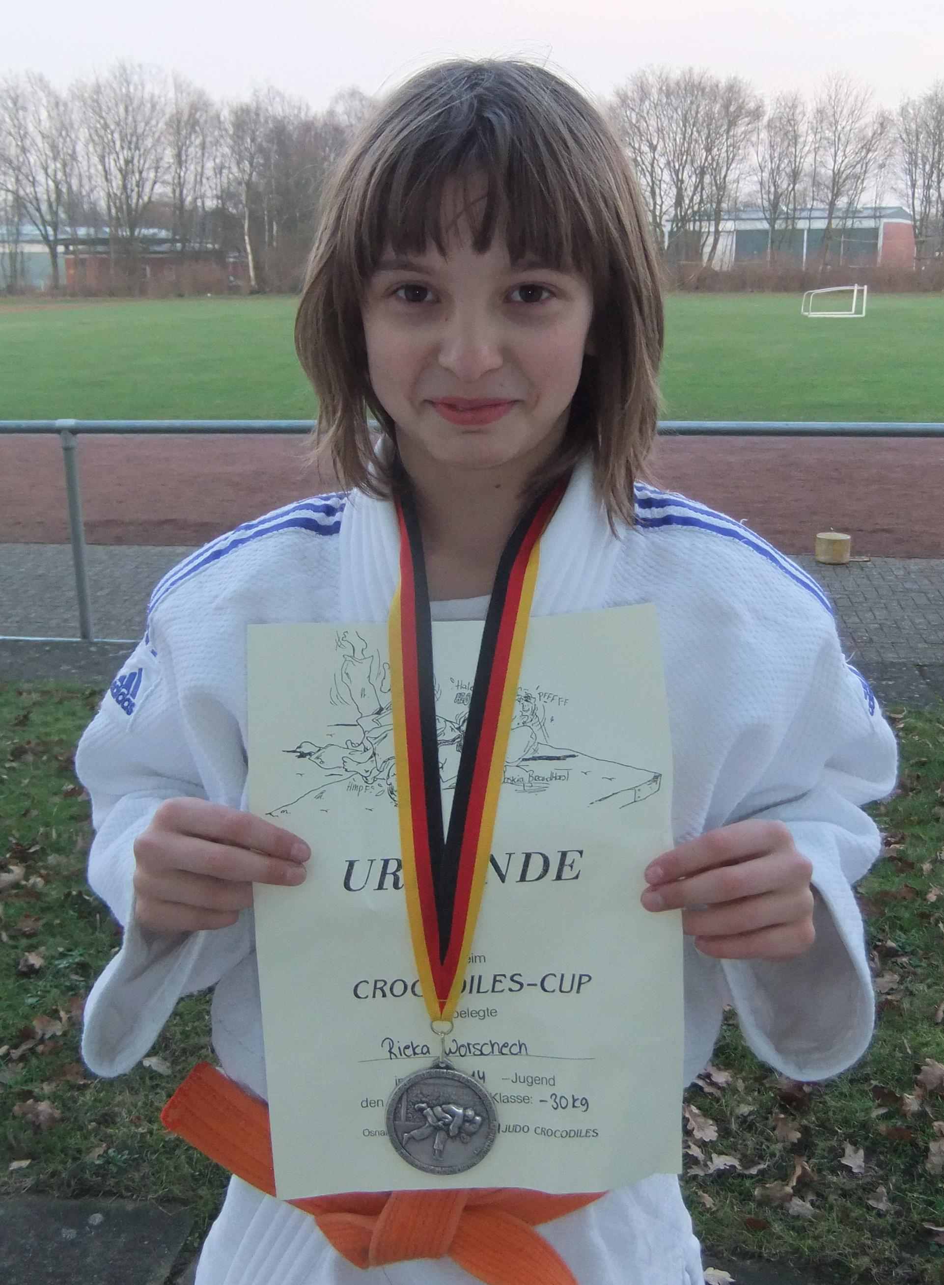 Oldenburg Rieka Worschech, die ihre erste Saison in der Jugend U 14 kämpft, fand beim Croco Cup in Osnabrück einen guten Einstand. Das Turnier, das Anfang Februar von den Judo Crocodiles Osnabrück ausgerichtet wurde, war mit 600 Aktiven aus vier Landesverbänden stark besetzt. In der Gewichtsklasse bis 30 Kg musste sich Rieka nur der Kaderathletin Jana Gussenberg geschlagen geben und erreichte mit der Silbermedaille ein hervorragendes Ergebnis. Vereinskameradin Svenja Kloß (-36 kg) gewann das Trostrundenfinale vorzeitig und hatte mit dem dritten Platz ebenfalls einen guten Saisonstart.